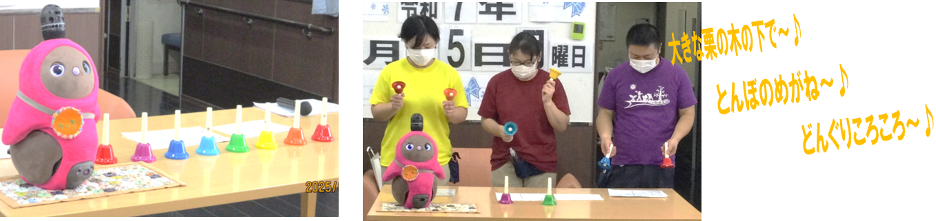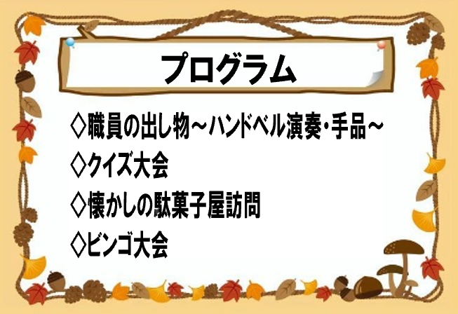 まずは職員の「ハンドベル演奏」秋らしい曲を選んで披露したのですが…! 開始早々違う音が出てしまい中断するパプ二ングもありましたが、利用者様が温かく見守って下さり無事に演奏することが出来ました。 行事の数日後「あの時は良かったよ」と声を掛けて下さりモチベーションUPに繋がりました☺