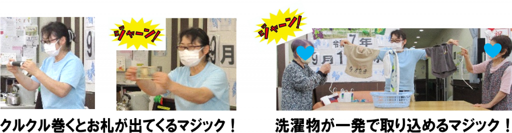 次は「手品」一生懸命練習したのに「あれ?あれれ・・?」 それでも最後には歓声が上がり利用者様にも参加いただき大いに盛り上がりました!