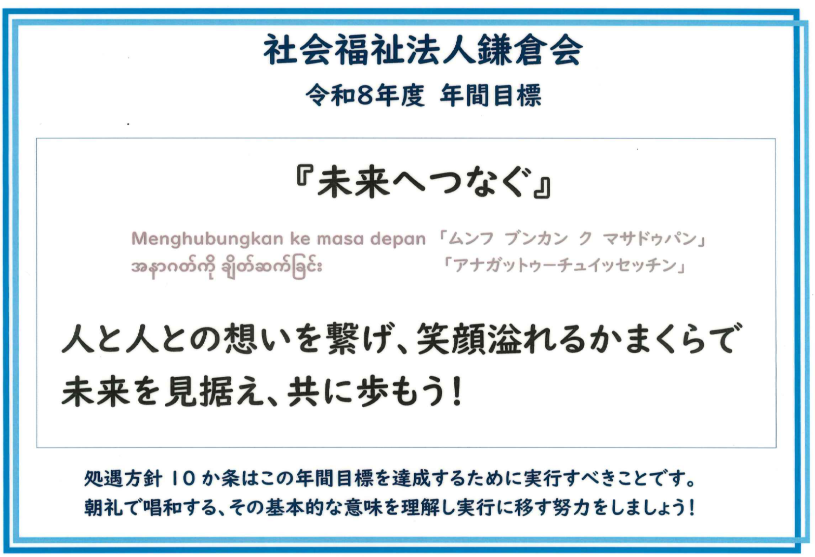 入居者様や職員達の笑顔に溢れた鎌倉が、その想いを繋げこれから先の未来に希望を抱き共に歩んでいくのだ!…といったとても前向きな目標に決まりました。