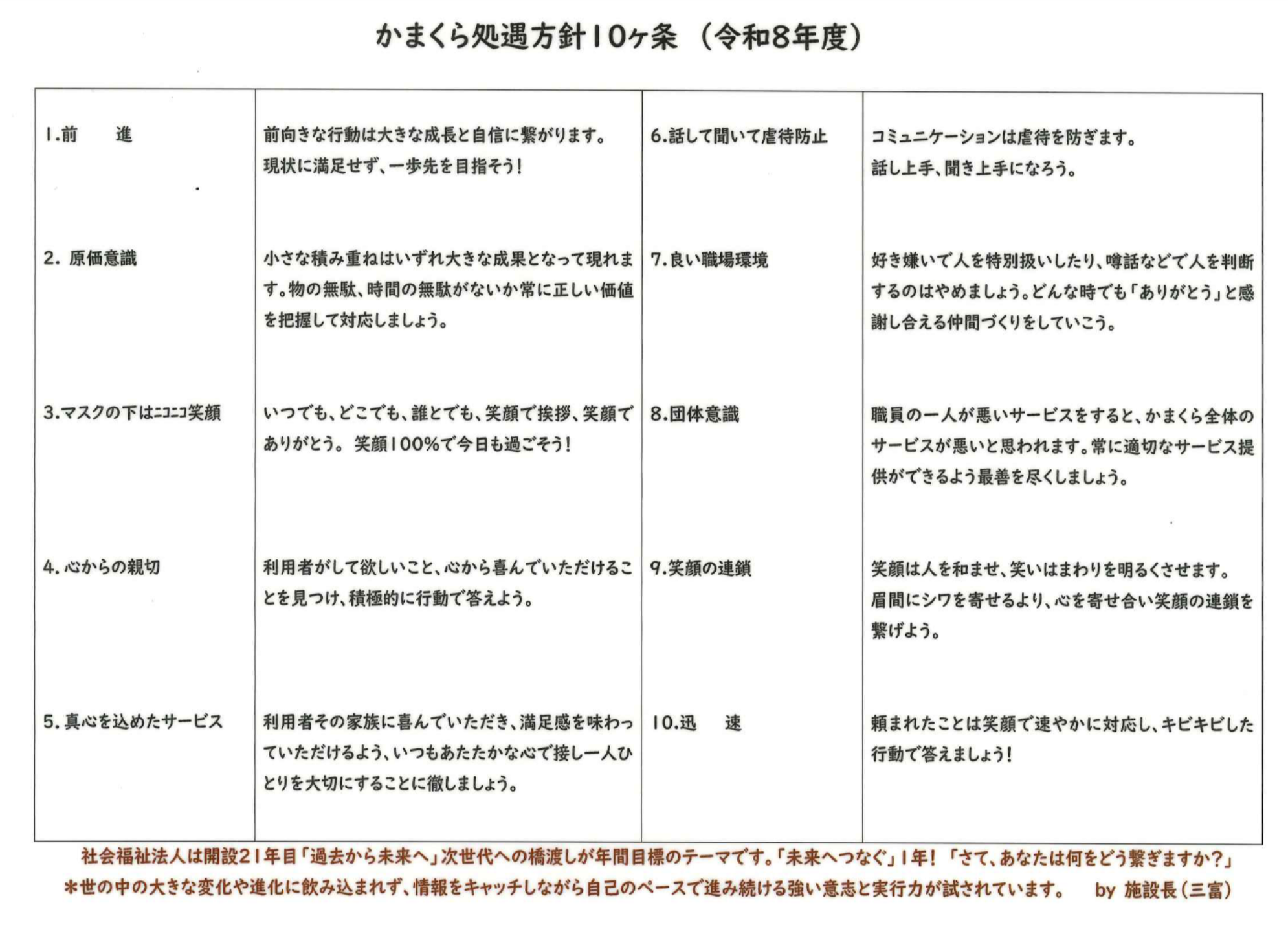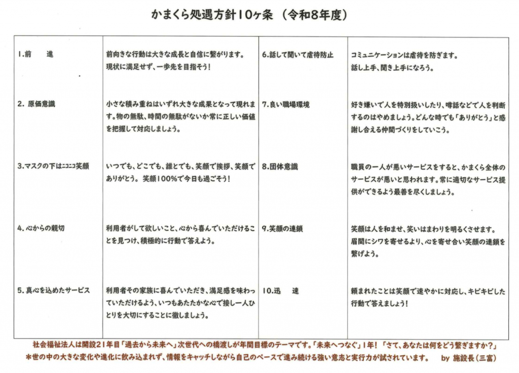 また、年間目標と一緒に朝礼で唱和している月間の目標が「かまくら処遇方針10か条」と呼ばれるものです。これは年間目標を達成するために毎月の目標として掲げています。