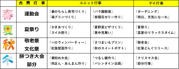 鎌倉会では毎年、季節に合わせて企画した合同行事と、各ユニット毎にほぼ毎月実施されているユニット行事・デイ行事等、様々な行事を計画しております。